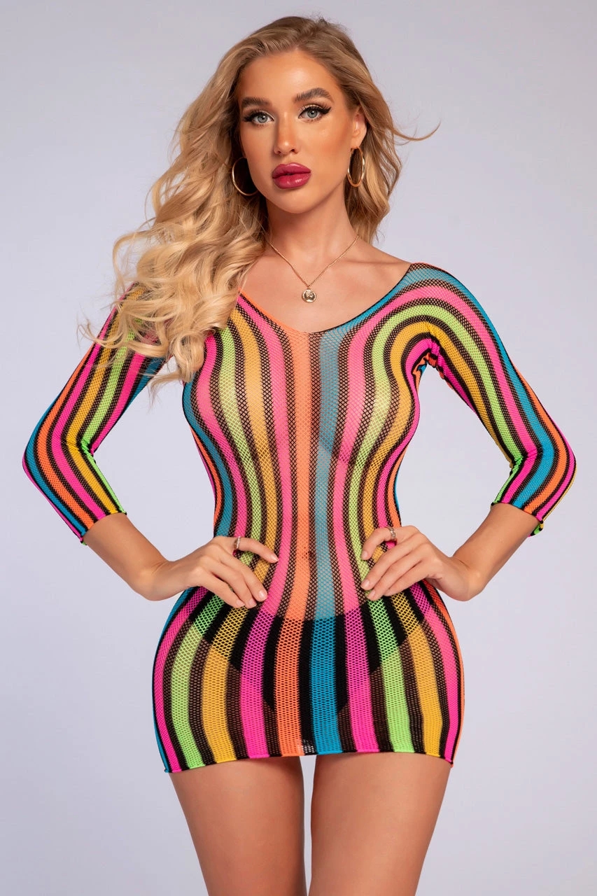 This multicolor, fishnet chemise features long sleeves and a scoop neckline.