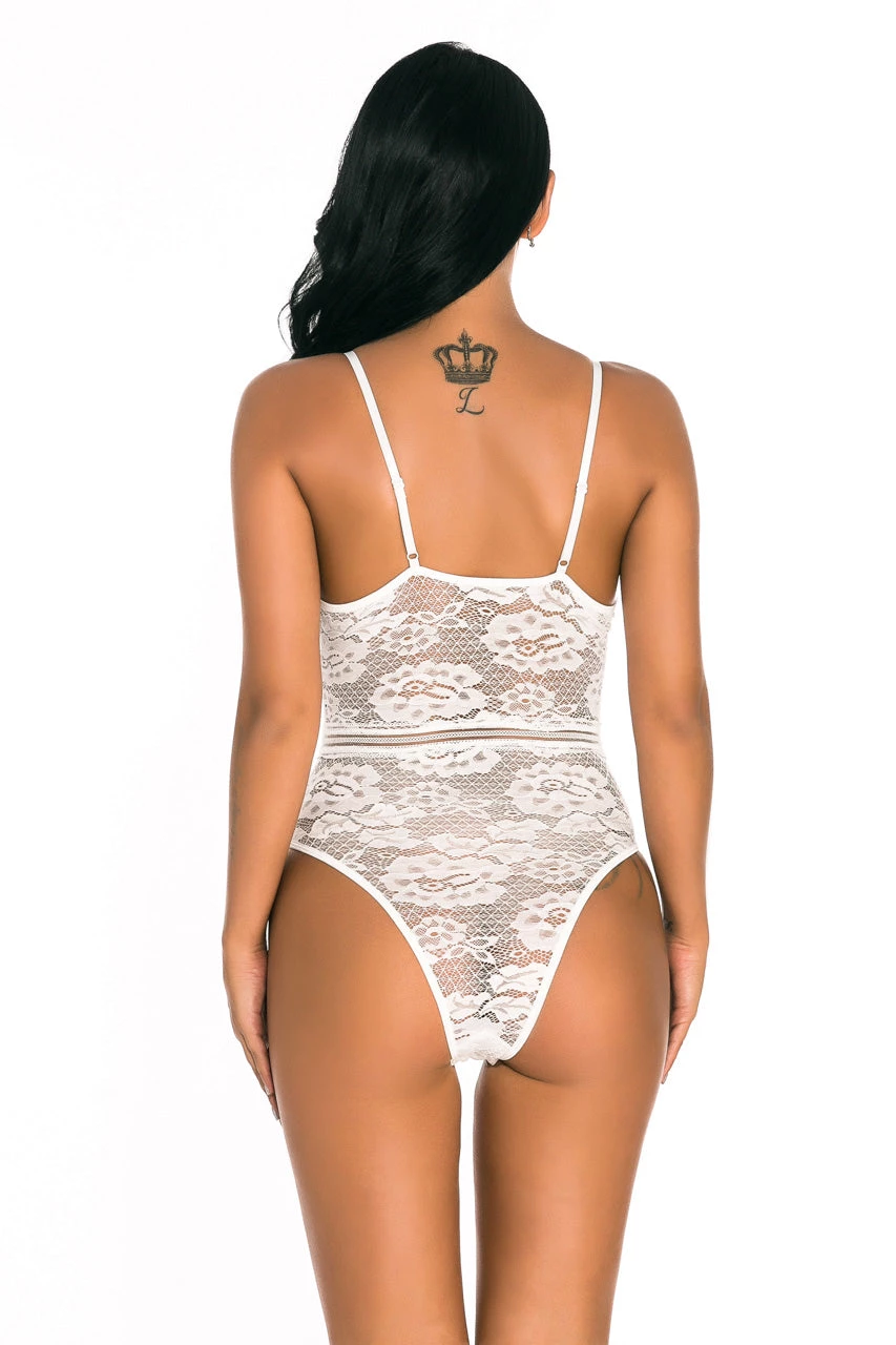 This romantic teddy features a flirty patterned lace, eyelash lace trim cups, faux belted middle, and a cheeky cut back.