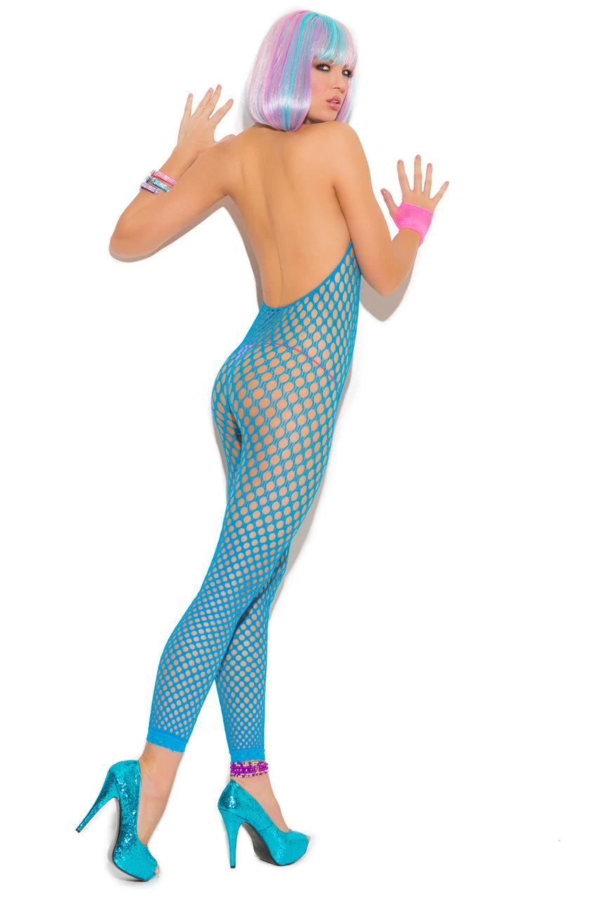 This neon blue, pothole bodystocking features a keyhole cut out bust, hot pink satin bow, open crotch, and footless design.