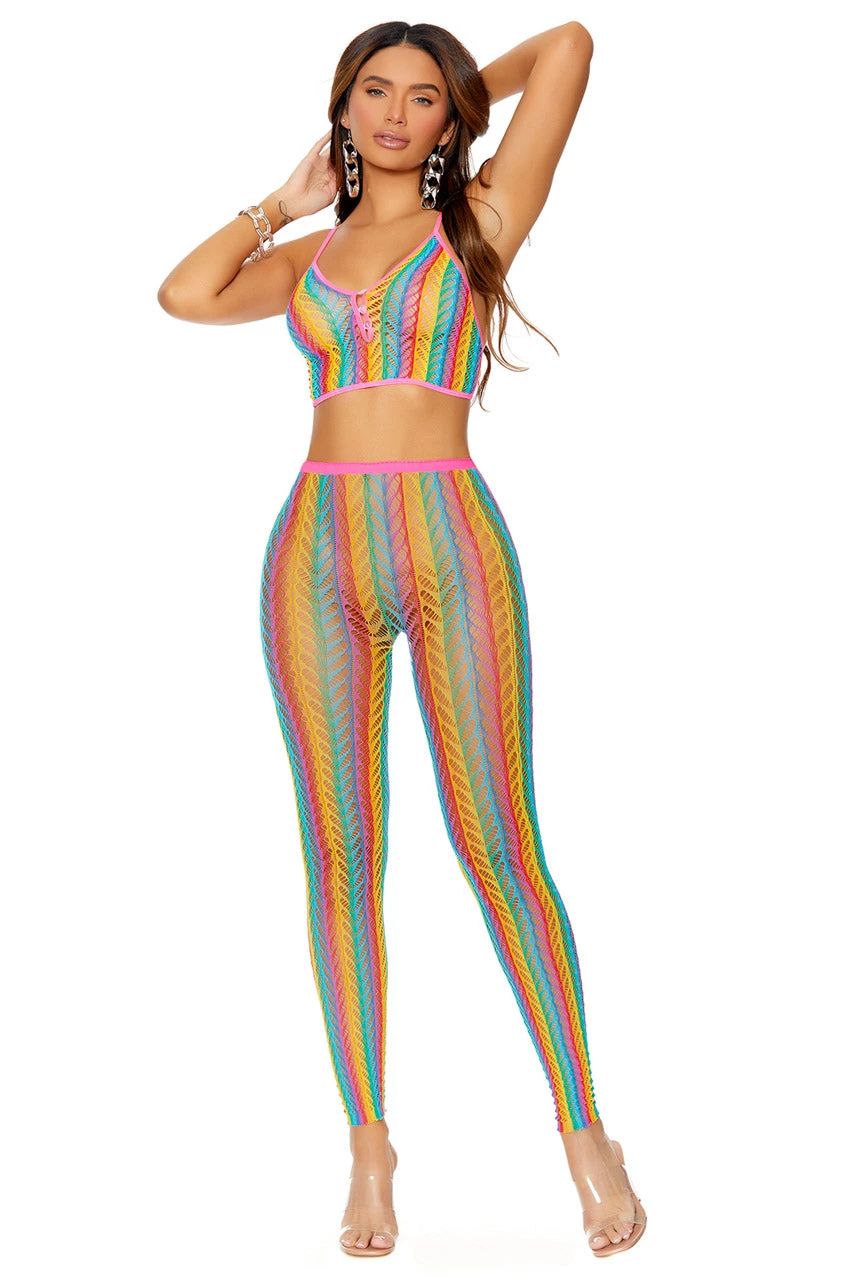 This fun, rainbow print net set includes a cropped cami top with button front detail and matching leggings.