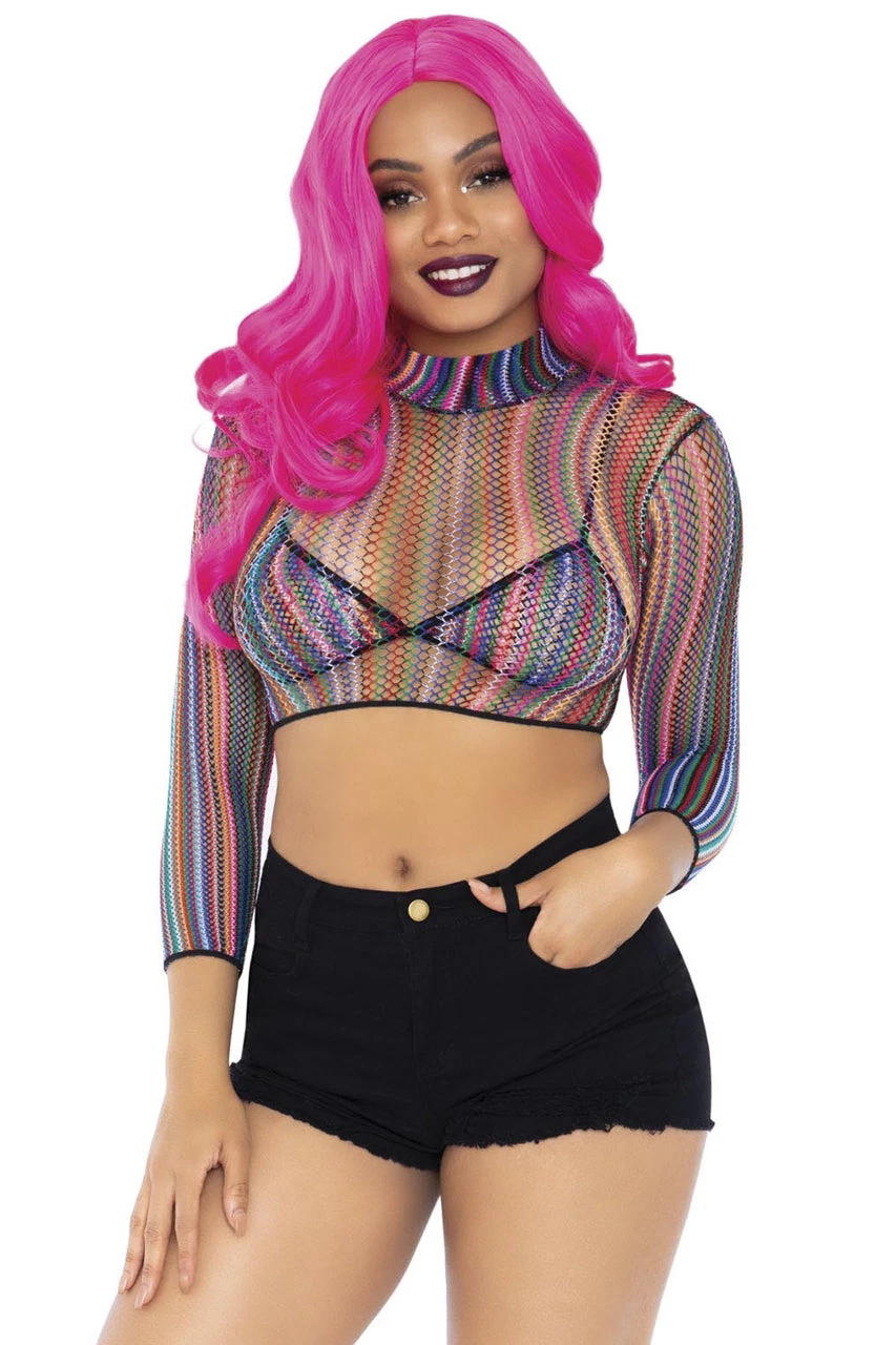 This three-piece set includes a colorful fishnet crop top with long sleeves, a triangle bikini top and matching thong.