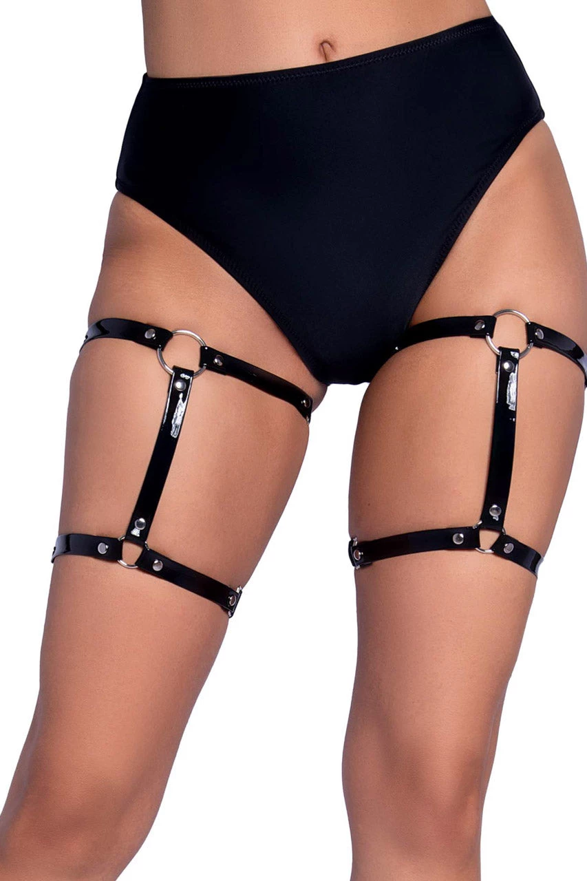 These black vinyl leg garters feature dual straps, O-rings, and studs.