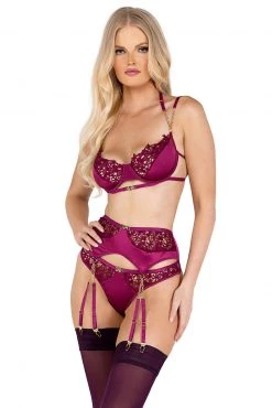 This three-piece set includes a jewel toned, embroidered lace and satin bra top with underwire cups, a strappy underbust detail with gold hardware, gold chain straps, a hook and eye back, matching thong with gold hardware, and a high waisted garter belt with dual garter straps and a hook and eye back. (Stockings not included.)