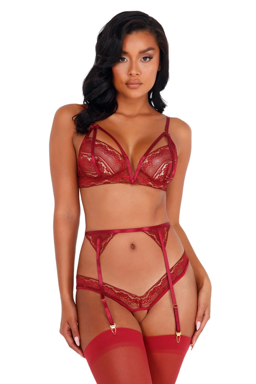This romantic lace set includes a strappy underwire bra top with cut out details, matching high waisted garter belt and open crotch thong. (Stockings not included.)